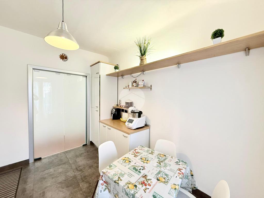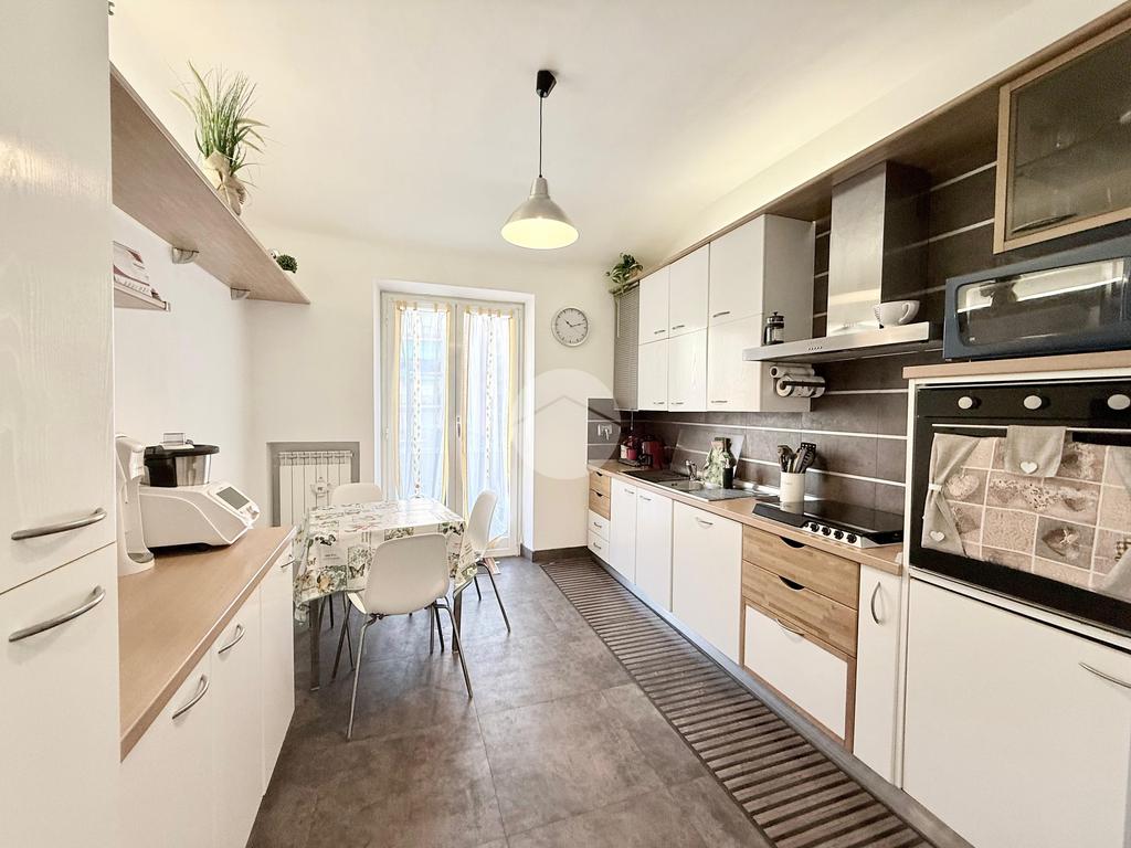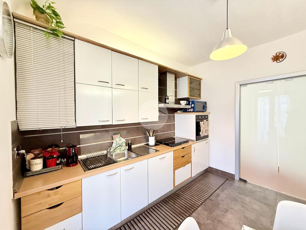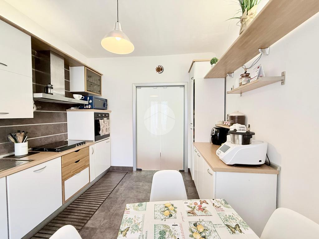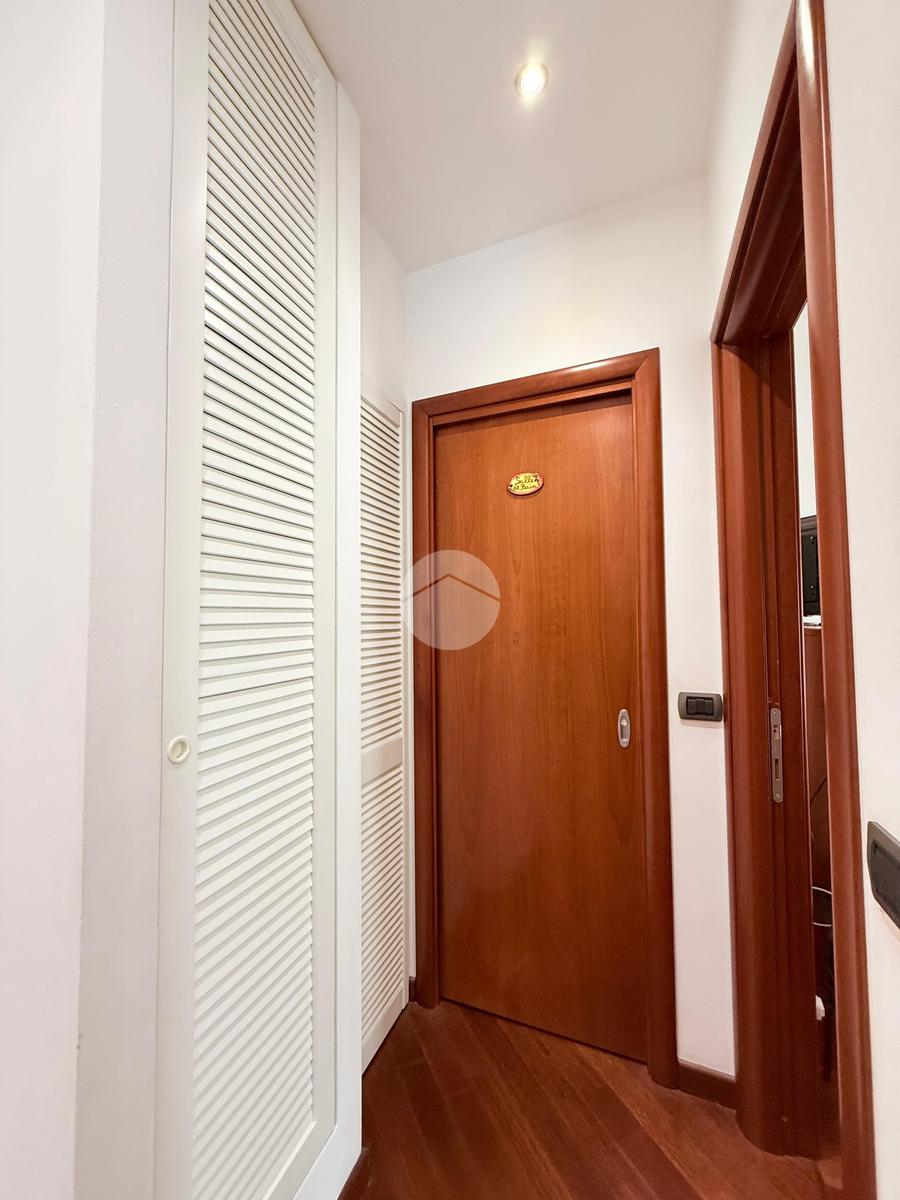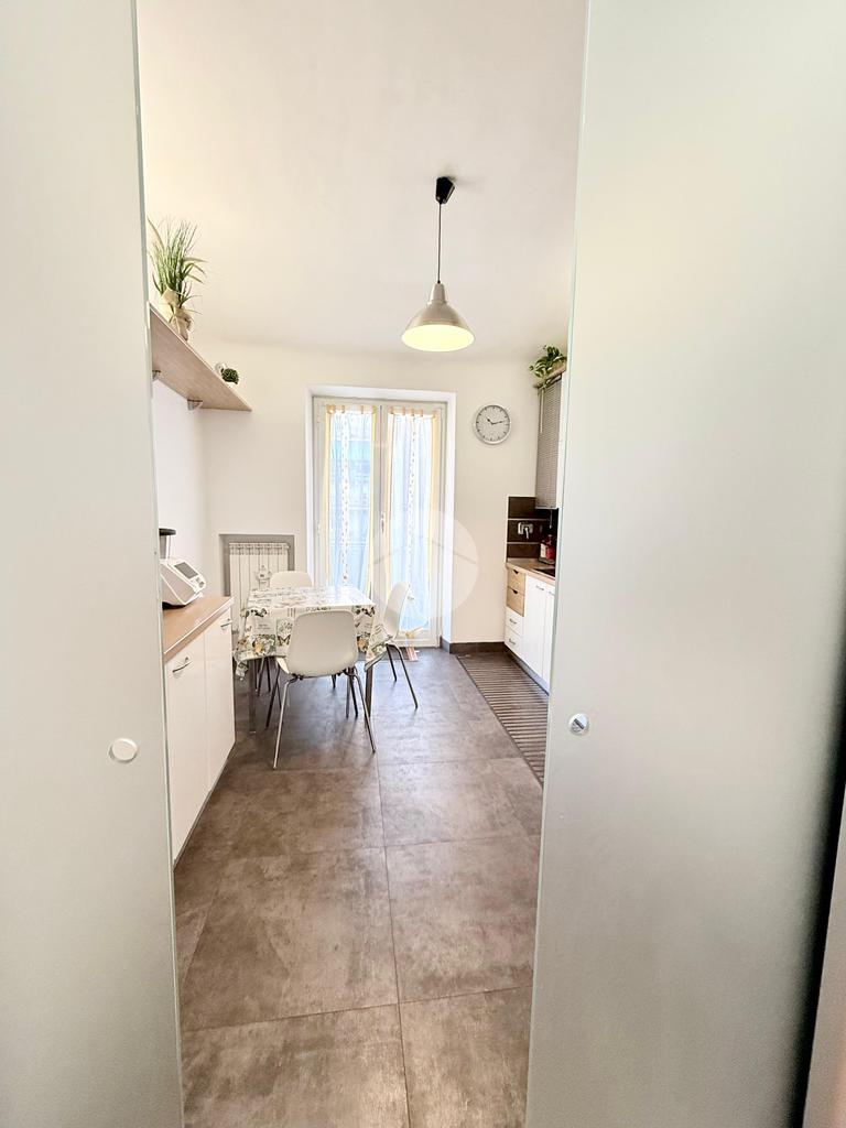 Internamente si presenta con un piccolo ingresso con due ripostigli, una porta in vetro satinato a doppia anta scorrevole concede l'accesso alla cucina abitabile dotata di un comodo balcone esposto a nord.