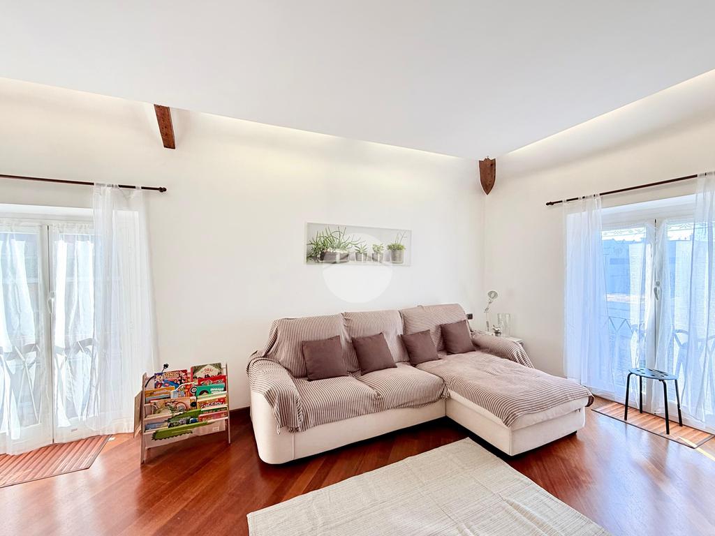 Il soggiorno di generosissima metratura mostra due porte finestre una esposta ad est mentre la seconda espone a sud.